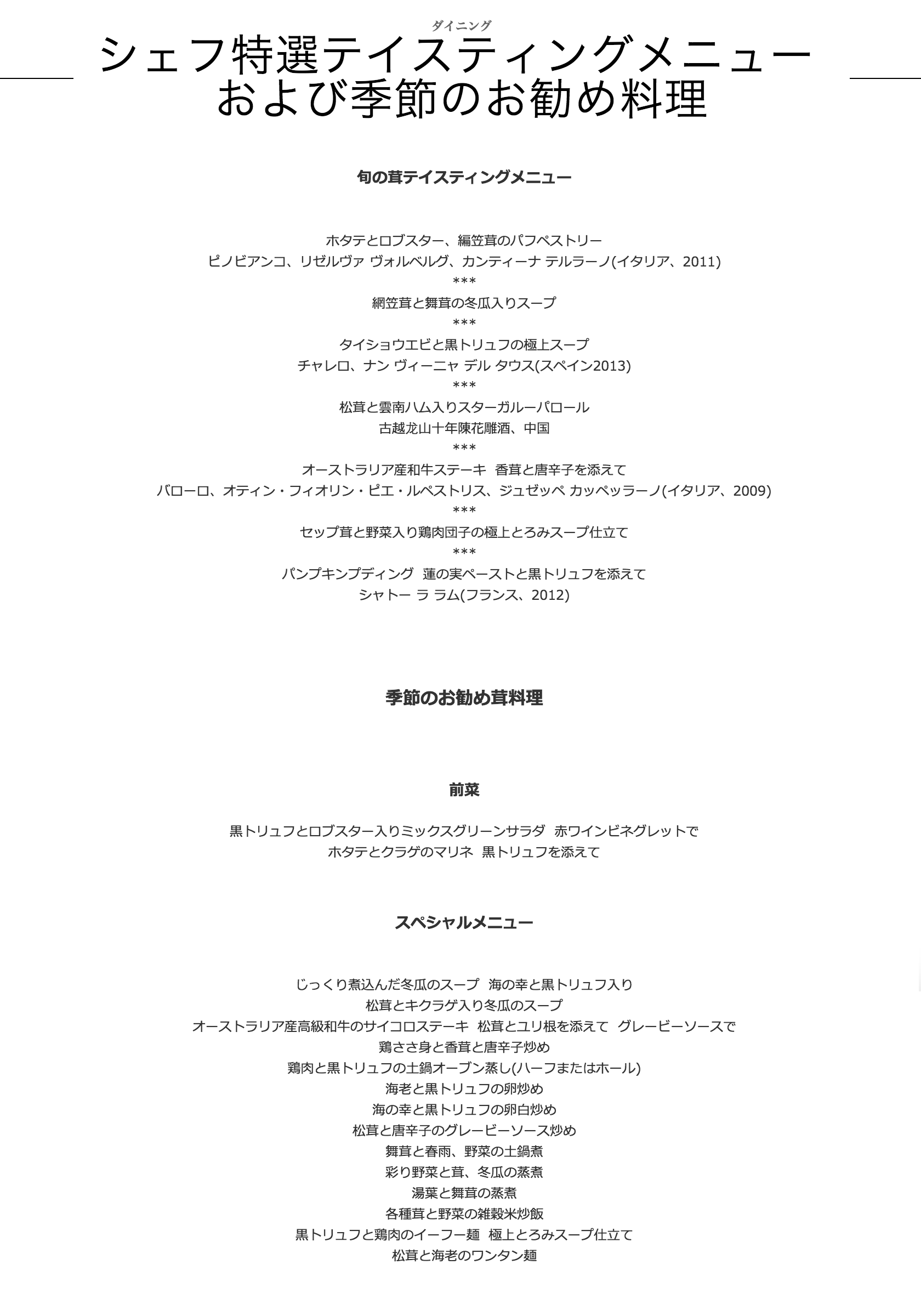 | ディナーおまかせコース | $3,500香港ドル | 56,000円 |